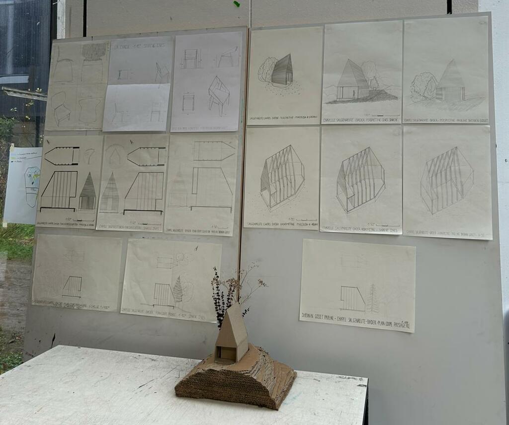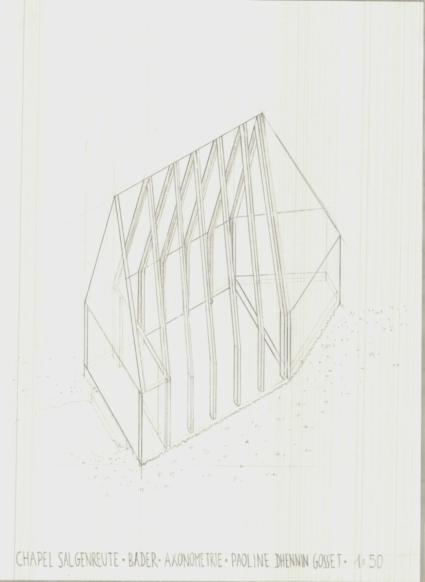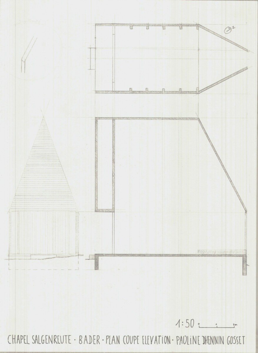 Dans le cadre du cours de représentation, nous avons pu réaliser la maquette ainsi que des plans et coupes, une axonométrie et une perspective de la Salgenreute Chapel de Bernardo Bader (Autriche) .